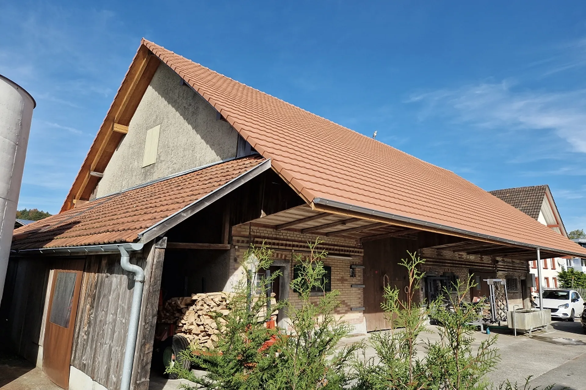 Für die Dacheindeckung arbeiten wir je nach Gebäude, Budget und Nutzung mit Ziegeln, Eternit, Trapezblech oder Sandwichblech.